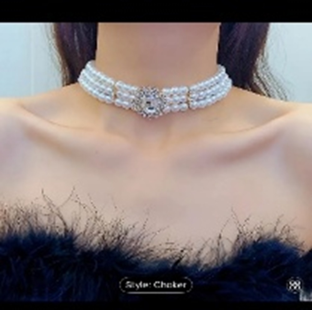 Layered pearl choker necklace with oval crystal rhinestone charm